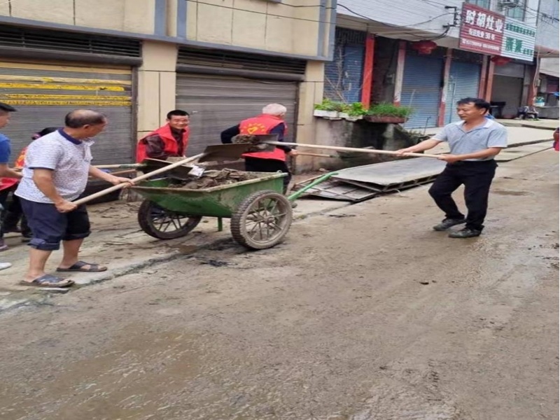 (组织道路清淤) 镇村协同:人大代表冲锋抢险救灾前沿 暴雨导致双飞村31户74名群众被困,县、镇人大代表与村“两委”干部组成应急小分队,冒雨将受困群众安全转移至民宿集中安置点,全镇共转移群众1431人。 由于暴雨导致双飞村全面断水断电,镇人大代表杜喜军、肖华刚等人联合电力、水利等部门全力抢修基础设施。同时,肖和友、侯美姬、肖香平、刘晓明、刘振华等人大代表与村支两委干部积极运送物资、协调设立了临时供餐点,满足受灾群众的基本生活需求。