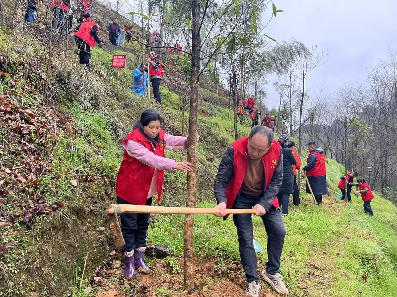 “植树不仅是义务,更是履职责任!”镇人大代表肖明霞拭着额头的汗水说。她今年提交的《关于加强生态脆弱区修复的建议》被纳入镇重点处理代表建议,此次植树区域正是建议落实的首个示范点。据统计,当天共种植楠木、桃花、桂花等兼具生态与经济效益的树种200余株,建成“代表示范林”“连心共建林”等主题片区4个。